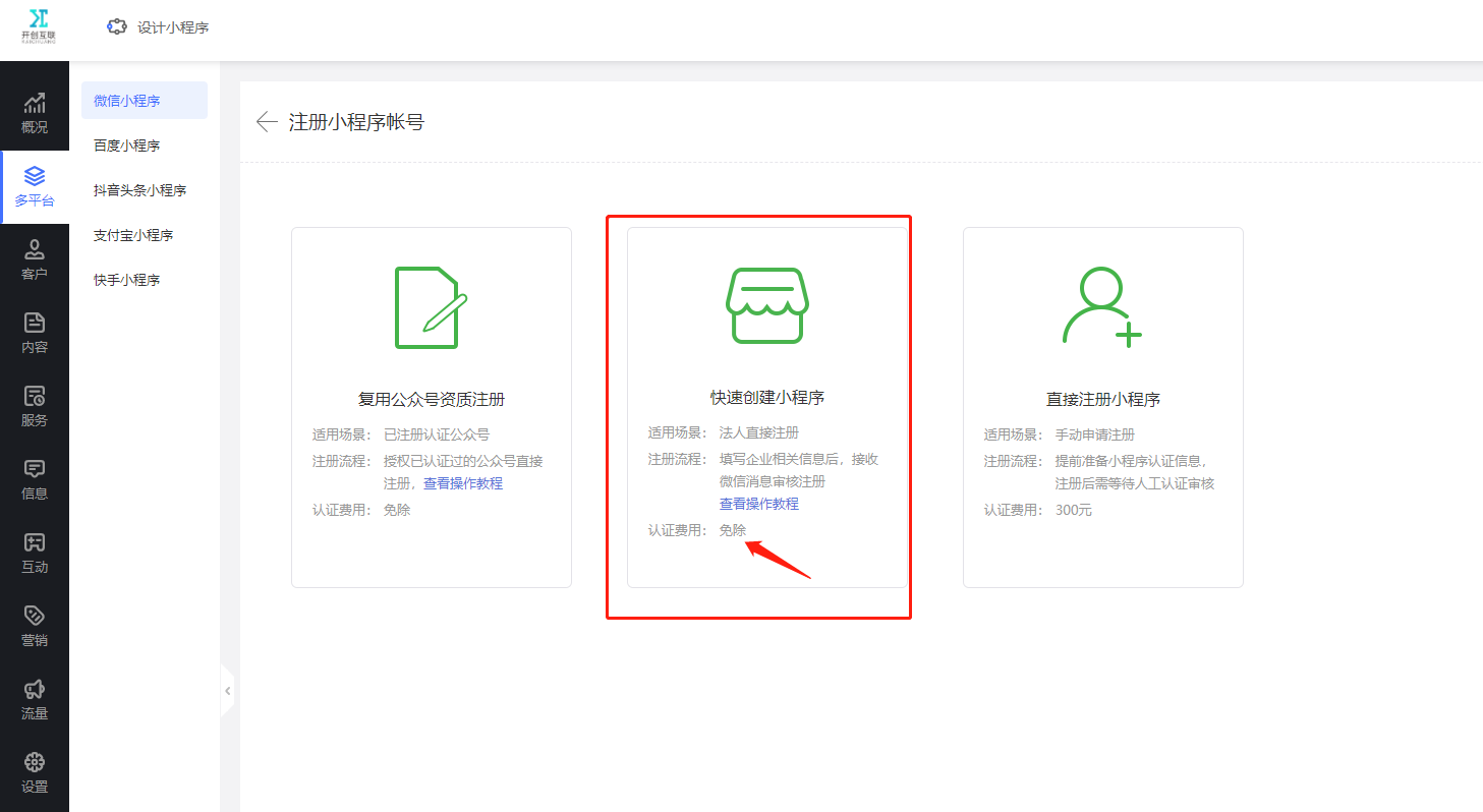七、在无代码小程序制作平台官网的小程序管理后台申请小程序账号,连接我们的第二点,在这个无代码小程序开发平台中申请小程序账号,是可以免除300元认证费的哦。 认证的话,建议大家直接用法人身份证来认证,这样速度是比较快的,小程序账号申请下来后,就可以绑定到做好的小程序上,这样就可以啦。